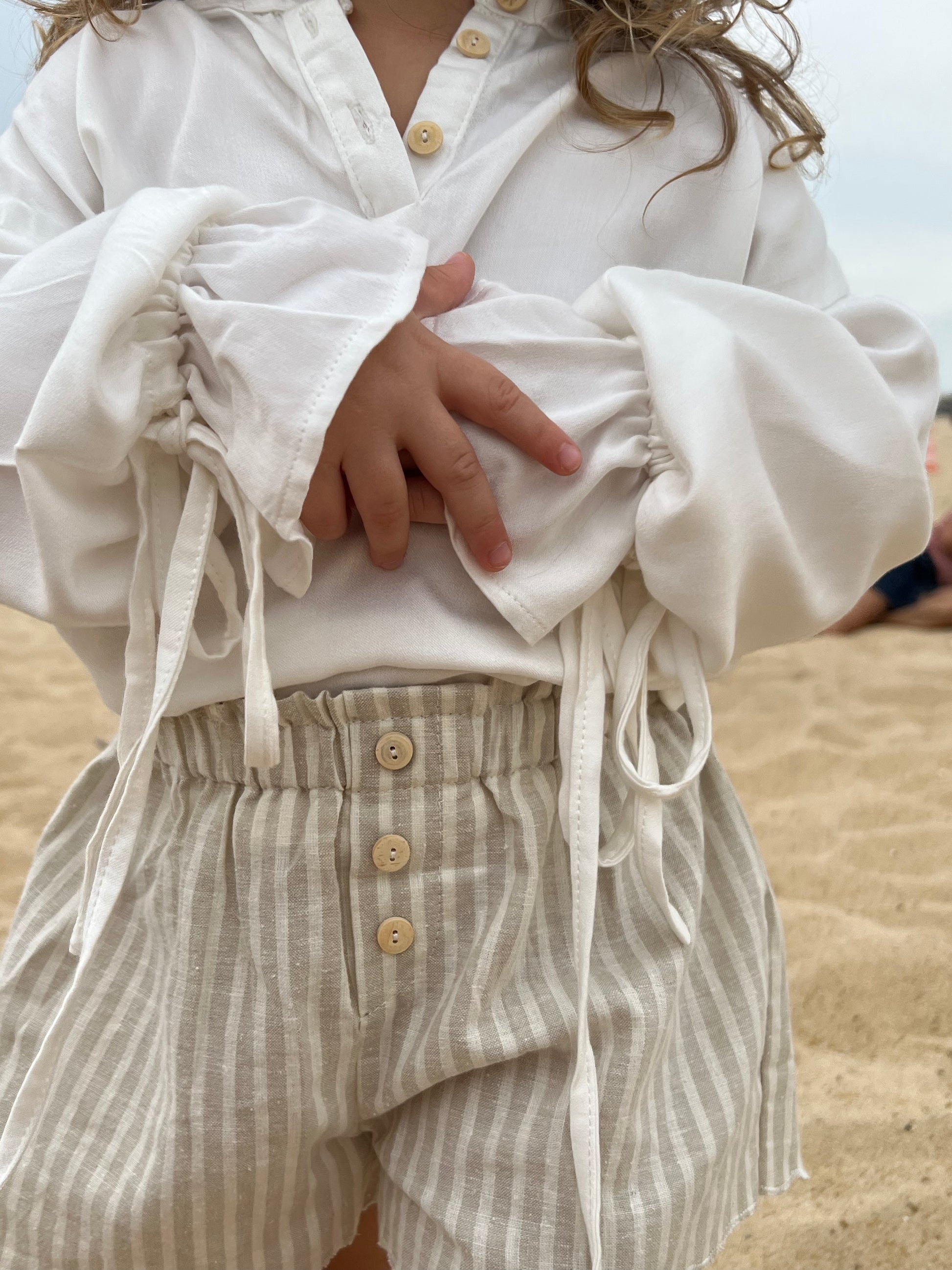 These cute little girl shorts are made in an hemp and organic cotton blend with white and light brown stripes.