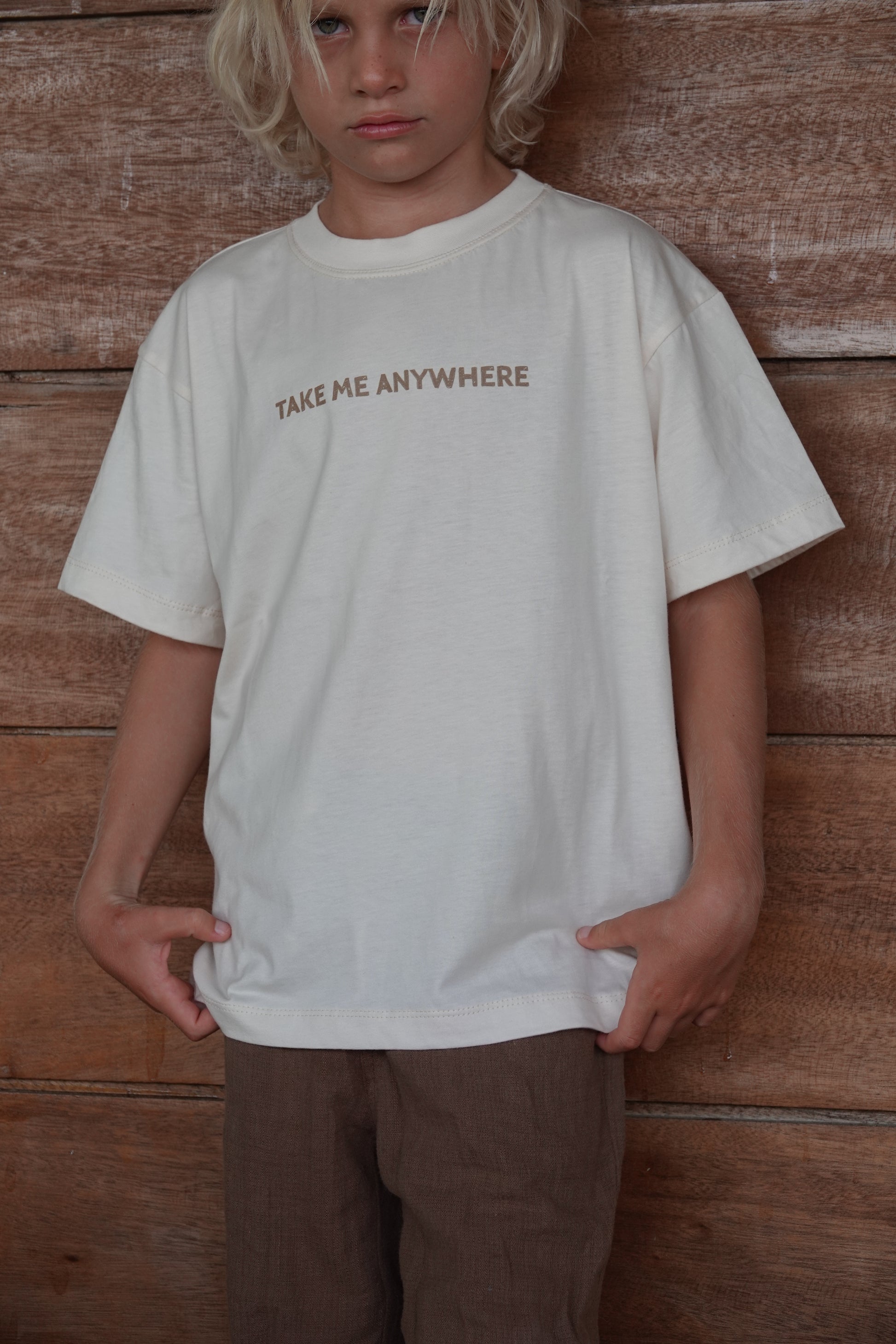 An easy, laid-back tee made for curious kids and everyday roaming. Crafted from soft 100% cotton, it’s light and comfortable from morning play to sunset walks. The front features the words “Take Me Anywhere”, while the back tells a story of travel and exploring the world with a wild, free spirit.